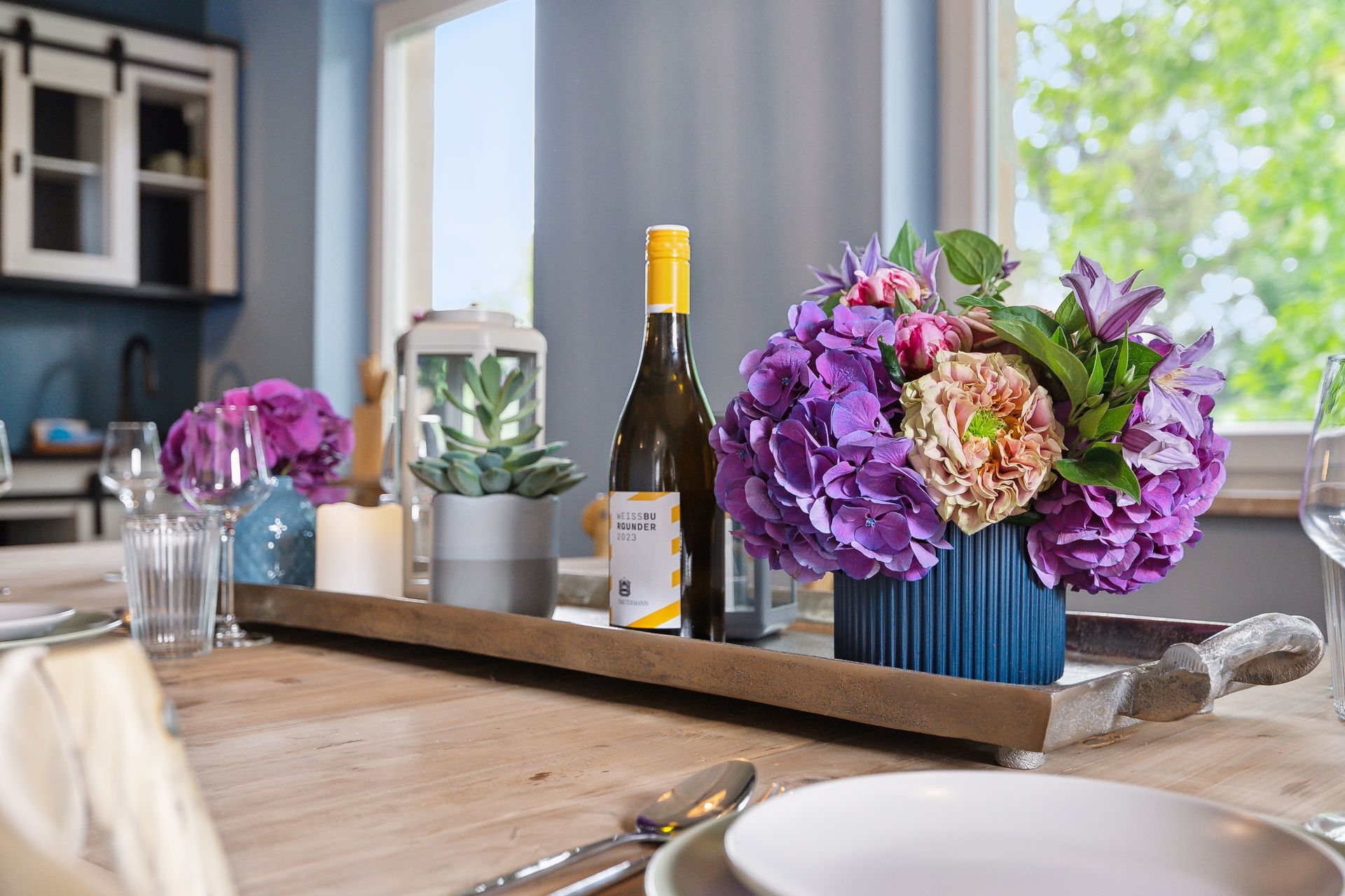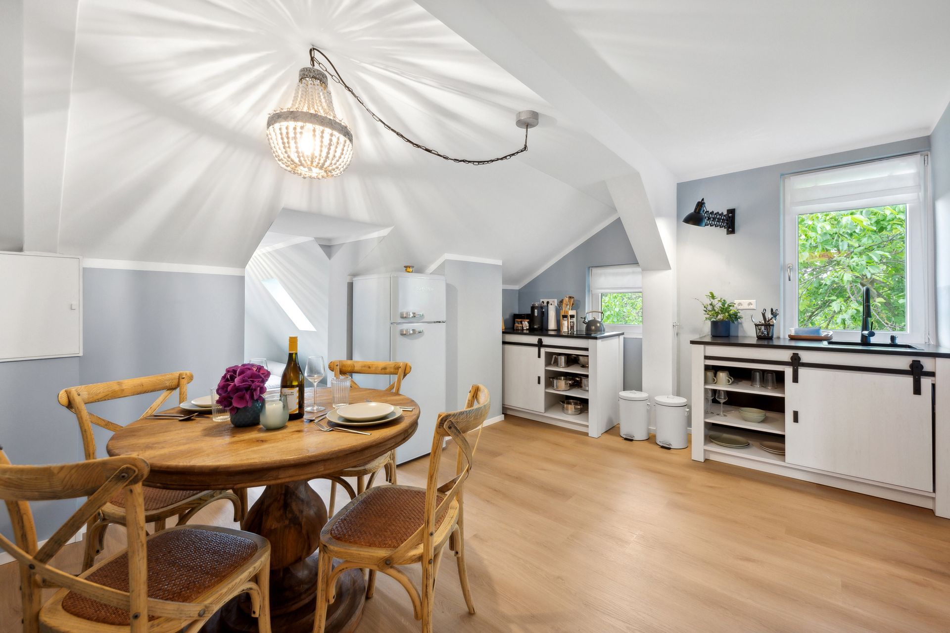 Die voll ausgestattete Küche bietet alles, was es für gemeinsame Mahlzeiten oder einen Kaffee zwischendurch braucht. Moderne Bäder mit bodengleicher Dusche, Waschmaschine und stilvoller Einrichtung runden das Angebot ab.